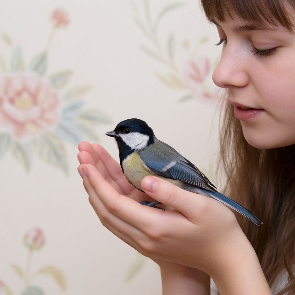 Young woman gently cradling a small bird with striking black, white, and blue plumage, set against a backdrop of floral wallpaper in soft pastel tones.