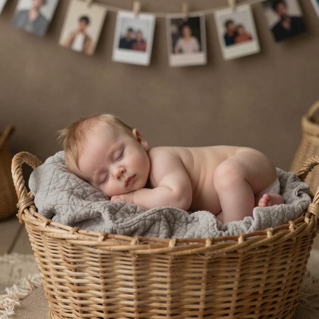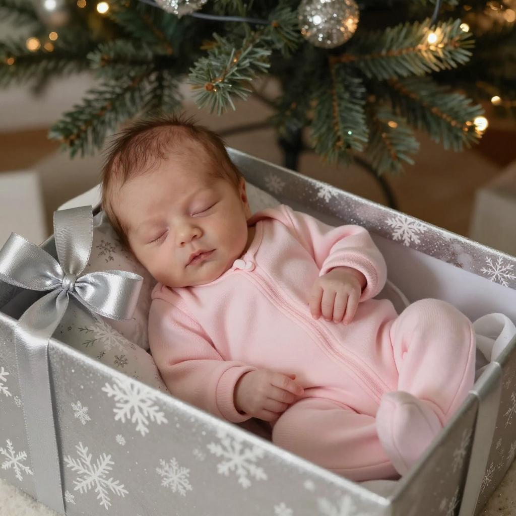 Photograph of a newborn baby with light skin and fine hair, dressed in a pink onesie, sleeping in a silver gift box adorned with white snowflake patterns and a large, shiny silver ribbon. The baby is under a Christmas tree, surrounded by soft, warm lighting. The camera angle is slightly above, capturing the baby in sharp focus while the background is gently blurred. The tree branches and gift box are visible, with subtle bokeh from the tree lights.