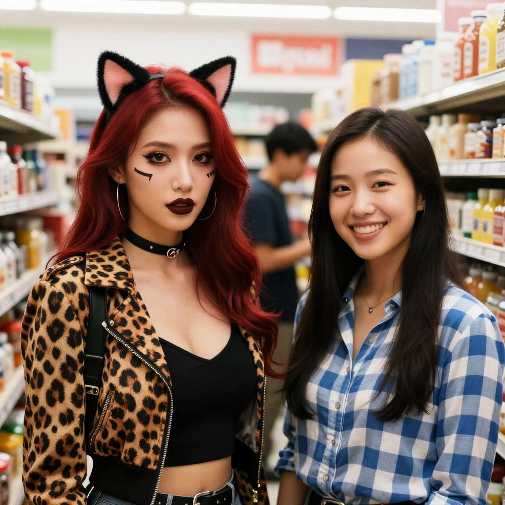 Photograph of two women in a busy convenience store. Woman on left has red hair, cat ears, face paint, leopard print jacket, choker necklace, and cleavage. Woman on right has long dark hair, blue and white checkered shirt, smiling. Background filled with shelves of products, another man in the background.