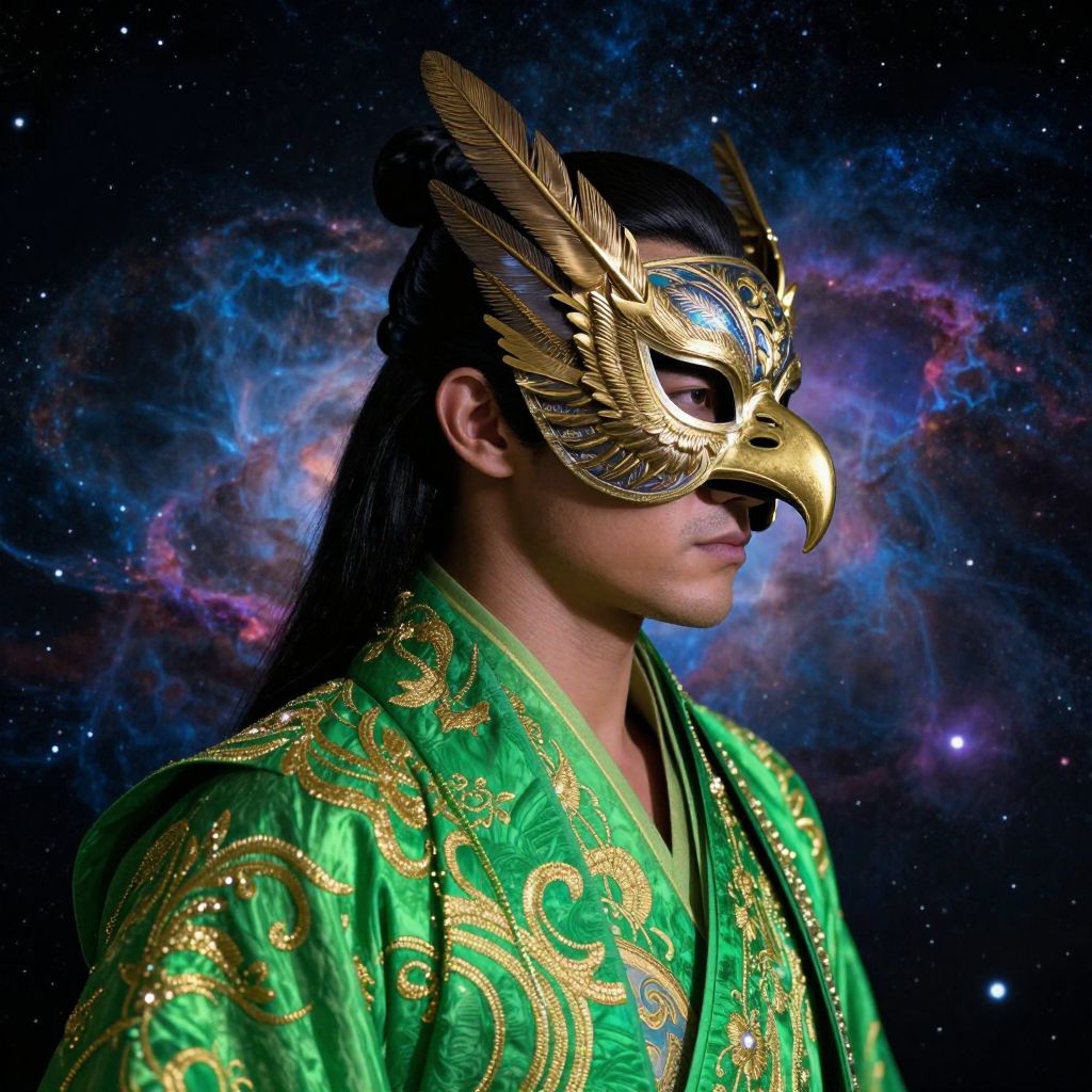 Cinematic style, close-up three-quarter profile portrait 60-degree angle, facing right of a clean-shaven man with a strong, masculine jawline, wearing a traditional samurai robe in vibrant fluorescent green, The robe features intricate golden patterns that shimmer with subtle radiance under the lighting, contrasting sharply with the glowing green fabric, His long, dark hair is pulled back into a sleek man bun, accentuating his defined features, He wears an intricate golden eagle-shaped mask, beautifully detailed with lifelike feathers that fan out from the sides, The mask’s beak is slightly open, lending him a fierce, commanding presence, while the feathers catch the light with hints of metallic gleam, The background is a vast, dark expanse of space, dotted with stars and glowing nebula clouds in hues of blue, purple, and soft pink, creating an otherworldly aura that accentuates the surreal, cosmic setting, Starlight subtly reflects off his mask and the vibrant green robe, emphasizing the intricate textures of both, The precise, dramatic lighting illuminates every detail, from the delicate feathers on the mask to the rich texture of the golden embroidery, capturing the depth and intensity of his gaze against the infinite, mysterious backdrop of the cosmos