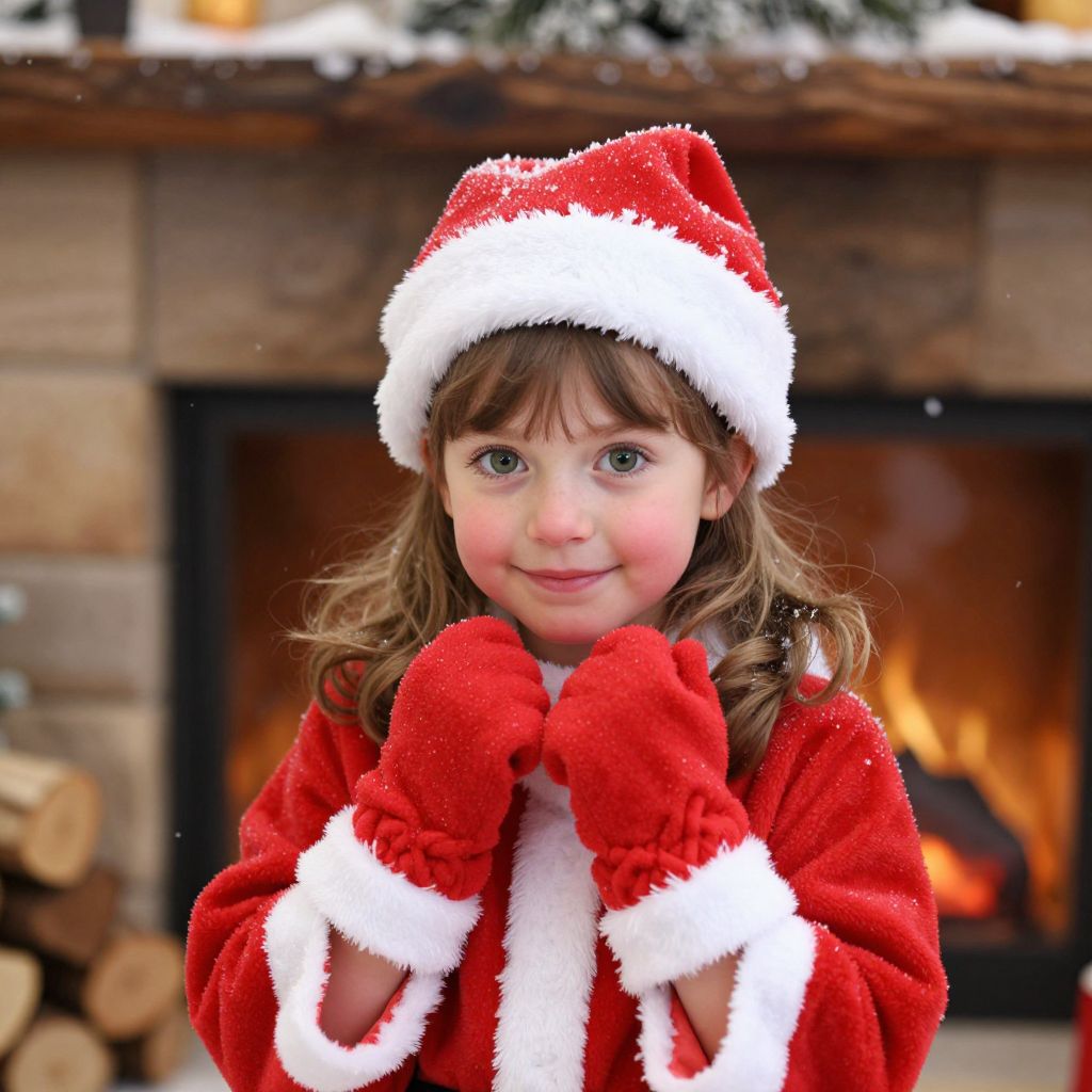 A cute girl in a Santa costume, wearing a red coat with a Santa beanie and festive red gloves, posing in a winter-themed photo session at a Christmas market, standing in front of a warm fireplace with pine logs, her face glowing with natural warmth, light snow gently falling around her, with detailed facial features, including soft pink cheeks and bright green eyes.