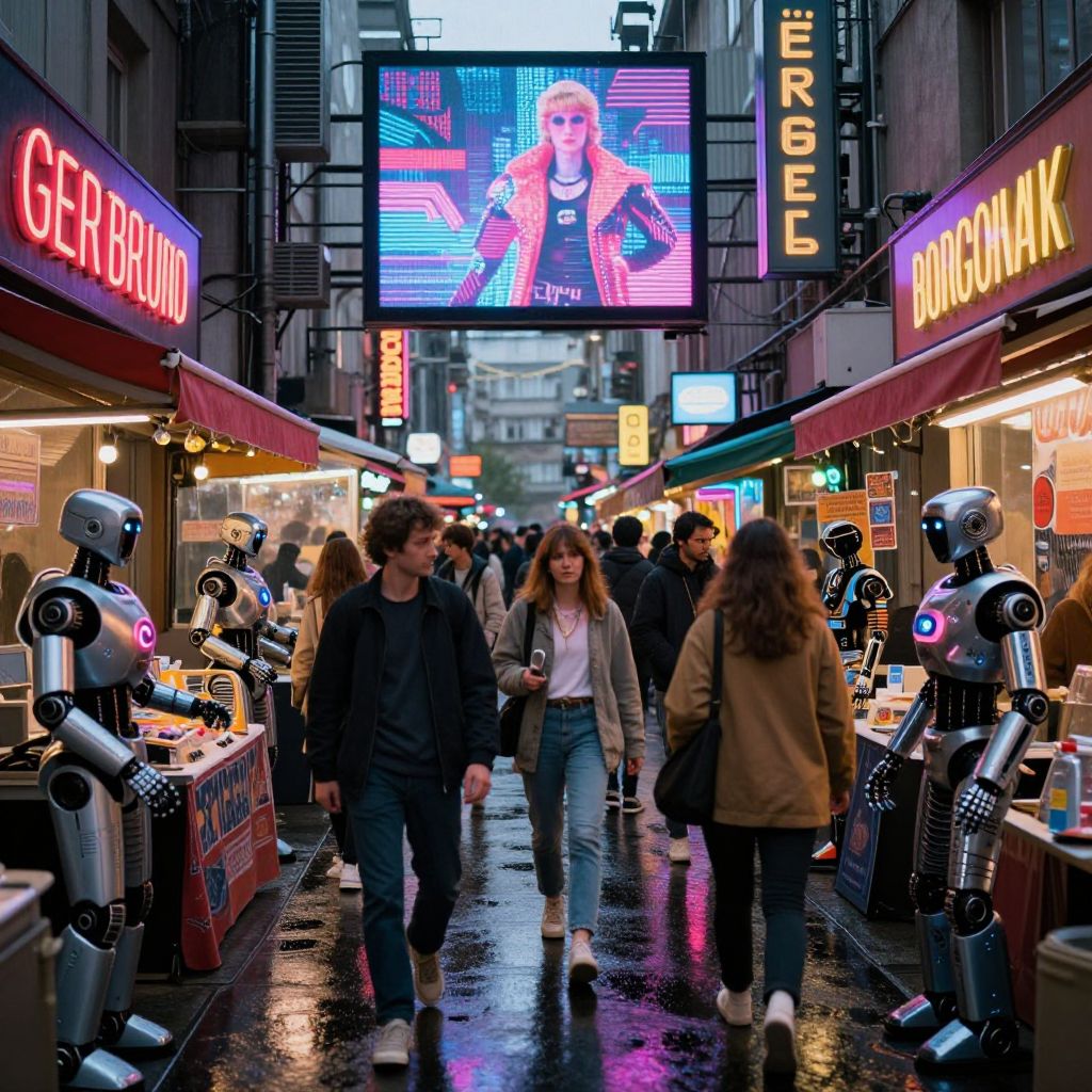 A vibrant cyberpunk street market scene inspired by the 1980s, featuring a neon-lit alleyway bustling with humans and futuristic robots. The market displays holographic advertisements in German, with a mix of 1980s retro and futuristic clothing styles. Reflections from neon lights shimmer on the wet pavement, enhancing the techno atmosphere.