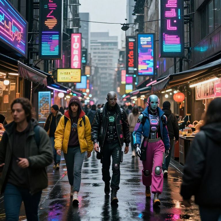 80er inspired cyberpunk street market bustling with robots and humans, holographic advertisements in German, futuristic clothing mixed with iconic 1980s styles, bustling neon-lit alleyways with rain reflections and a techno soundtrack vibe.
