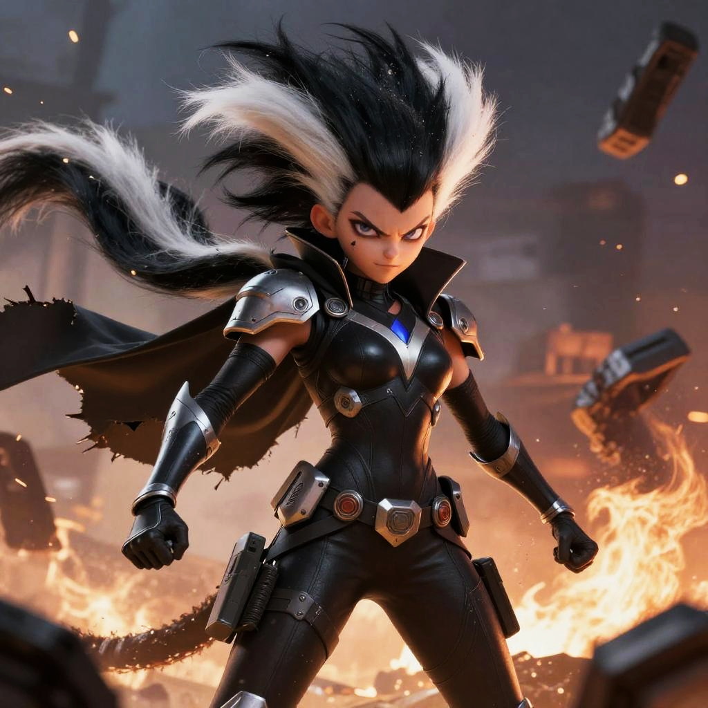 Skunk girl superhero standing in the middle of a battle scene, powerful and fierce expression, black and white hair catching sparks, torn cape fluttering, detailed armor with futuristic elements, vivid colors