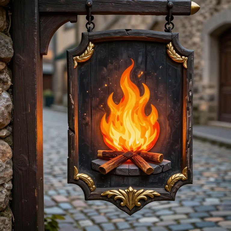 Tavern sign generator visualizing a colorful medieval fantasy tavern sign, showing a roaring fire in a hearth symbol, with ornate gold leaf accents and aged wood texture, mounted on a post beside a cobblestone path, vibrant lighting, cinematic composition.