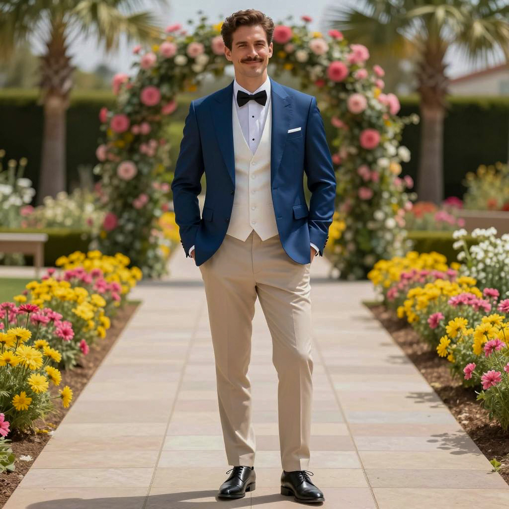 Formal man wear marriage, photorealistic, male groom, standing, garden pathway, colorful flowers, bright yellow and pink blooms, blue blazer, white vest, black bow tie, beige pants, black dress shoes, short brown hair, mustache, confident smile, hands in pockets, daytime, sunny, palm trees in background, archway with pink flowers, stone pathway, formal attire, wedding, stylish, well-groomed, natural light, vibrant colors
