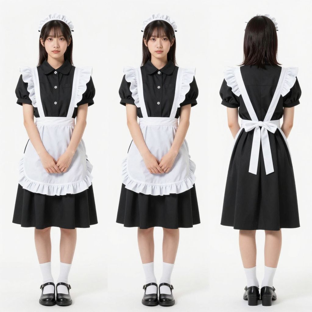 Photograph of an Asian woman with straight black hair in a traditional French maid outfit. She wears a black dress with puffed sleeves, white apron, and white frilled headpiece. The dress has a black bow at the neck and a white waist sash tied in a bow at the back. She stands in three poses: front, side, and back views. She has fair skin and wears black Mary Jane shoes. The background is plain white, highlighting the maid outfit's details. The image is well-lit, emphasizing the outfit's contrast and textures.