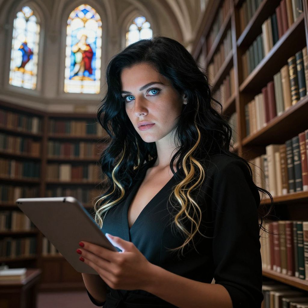 Photograph of a young woman with long, wavy black hair with blonde highlights, wearing a black V-neck top. She has pale skin, blue eyes, and is holding a tablet in a dimly lit, historic library with wooden bookshelves filled with books. The background features stained glass windows with colorful patterns. She has a focused expression, with red-painted nails visible. The lighting creates a soft glow on her face, highlighting her features against the shadowed library setting. The overall atmosphere is scholarly and serene.