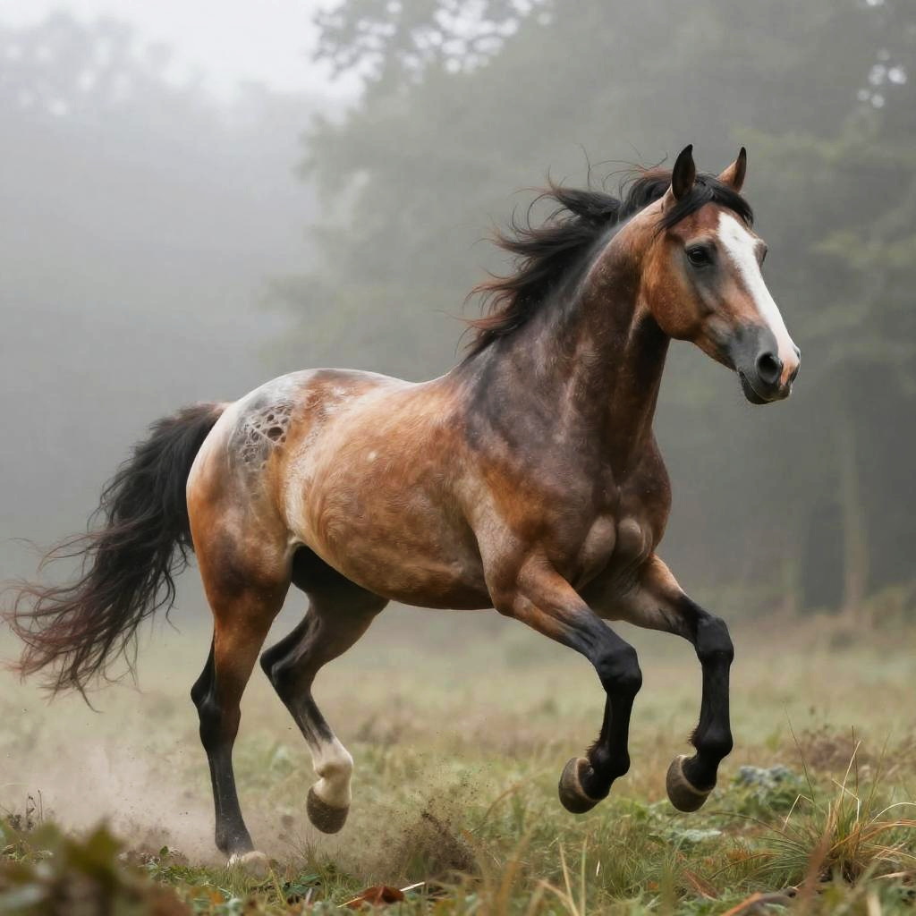 Horse body human head surreal creature galloping through misty forest, ethereal lighting, fantasy style, detailed anatomy, vivid colors