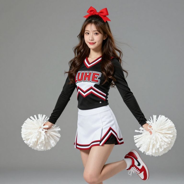 Asian cheerleader with long brown hair, black and white outfit, red bow, holding white pom-poms, jumping against gray background.
