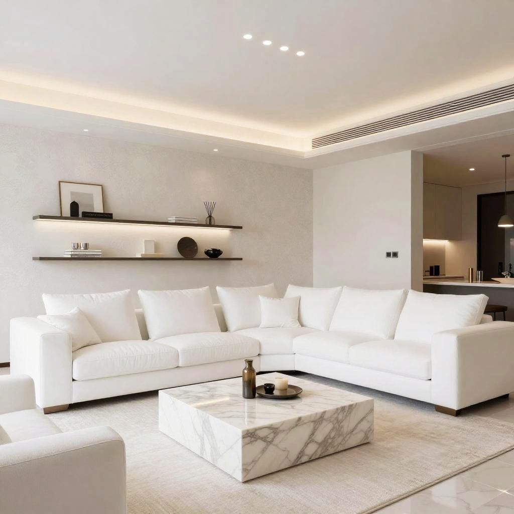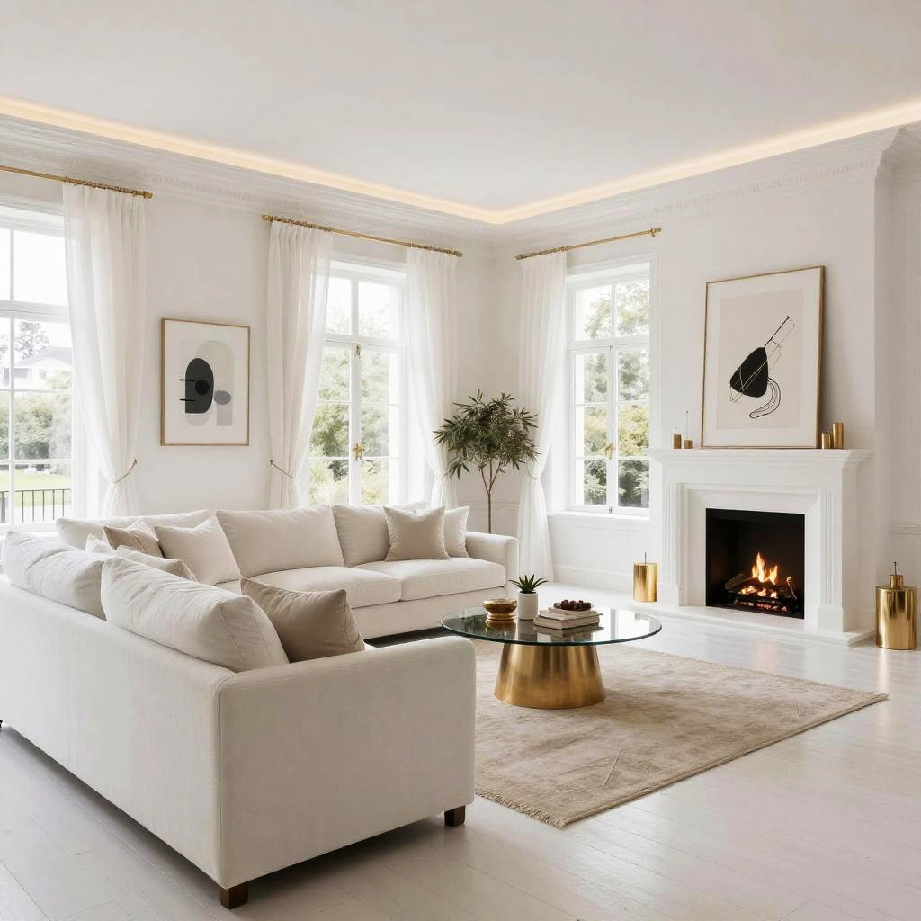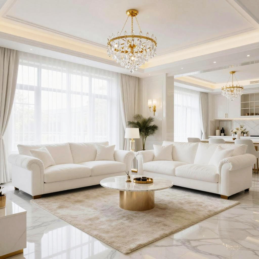Luxury white living room with modern minimalist design, plush white sofas, marble flooring, large windows with sheer curtains, gold accents, crystal chandelier, bright natural light, sleek furniture, and cozy atmosphere, ultra-realistic style.