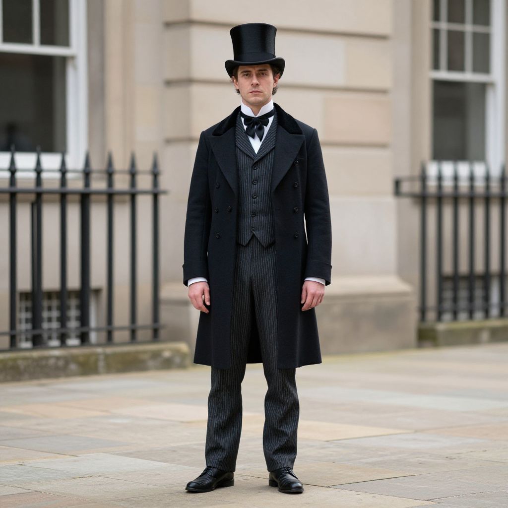 "Victorian Costume Male, man in a top hat and coat standing in front of a building"