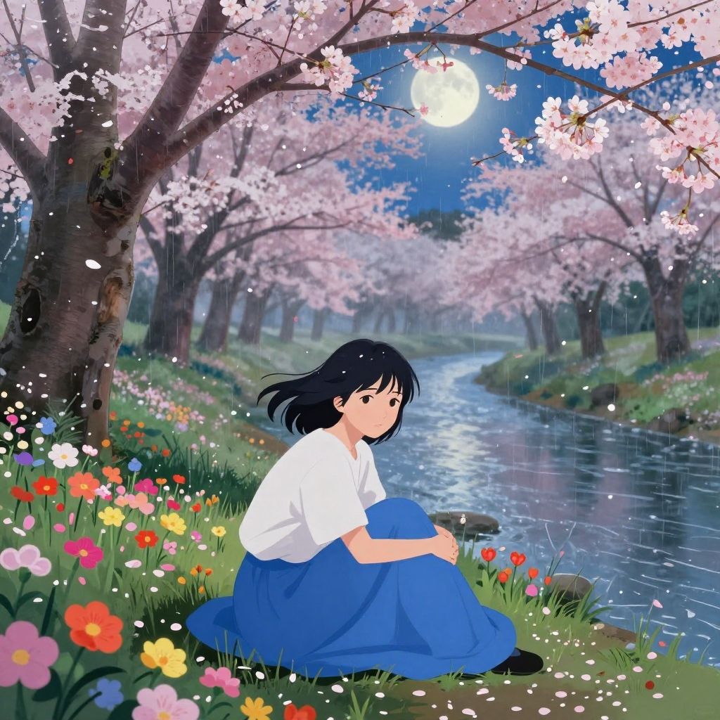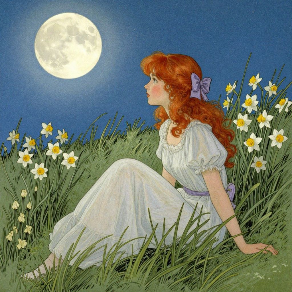 Dreamer sits gracefully amidst tall green grass, her vibrant orange hair adorned with a purple bow, as she gazes upward toward a radiant golden moon surrounded by delicate star-like flowers under a dark night sky.
