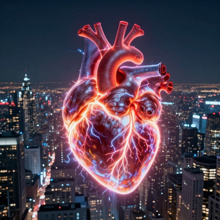Glowing, neon-lit human heart with electric blue and red lights hovers over a cityscape of illuminated skyscrapers at night. Digital