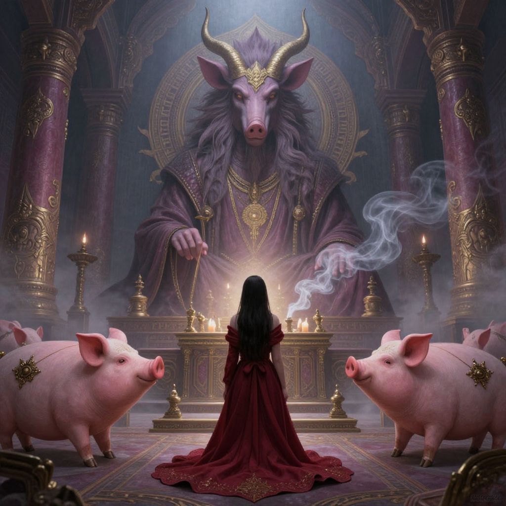 Tv_Daria_MXAI, A painting of Time Lord worshipping at the Pig temple, shrouded in mist, animal god, 8K, illustration, art by artgerm and Makoto Shinkai and Hitoshi Ashinano, smoke, cinematic, insanely detailed and intricate, hypermaximalist, elegant, super detailed, award-winning, puce and vermillion, mysterious, ancient, ritual, ethereal, trending in cgsociety, artstation HQ, ornate, elite, haunting, matte painting