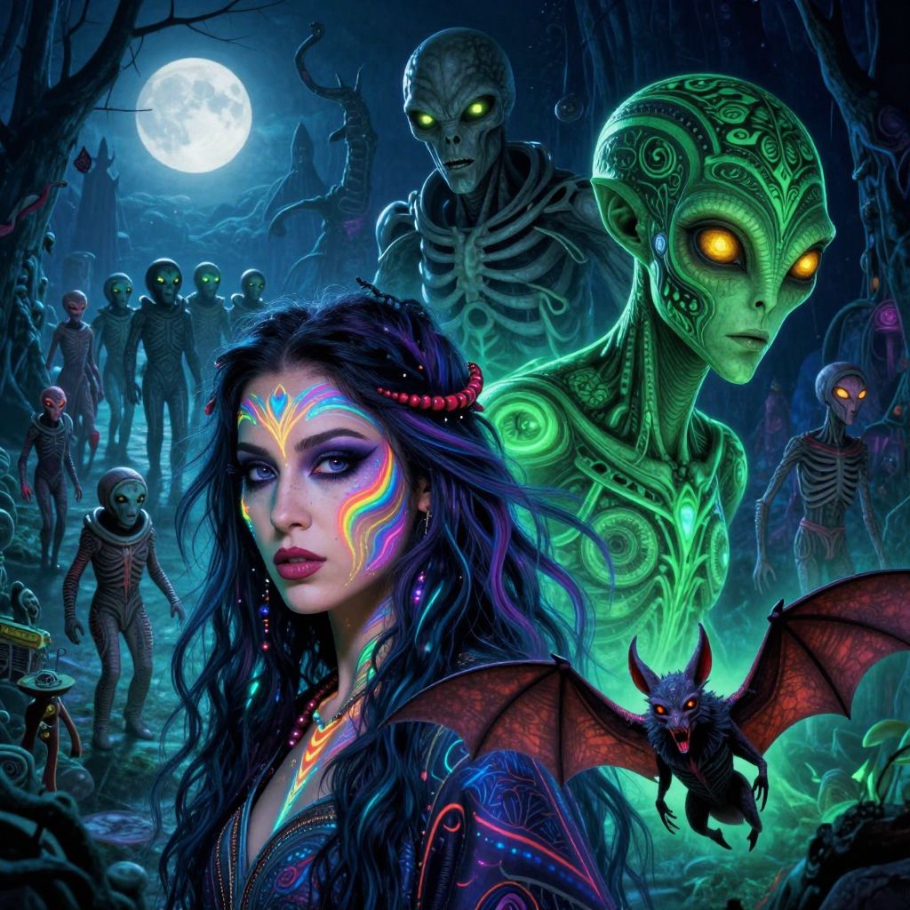 The image presents a vivid and surreal montage of various paranormal and supernatural elements. Dominating the foreground is a woman with long, flowing hair, her face adorned with intricate, glowing patterns that emit a rainbow of colors. To her right, a green-skinned alien with glowing eyes and elaborate markings gazes intently, while a skeletal figure with glowing eyes looms in the background. A creature resembling a bat with multiple heads hovers in the lower right corner, adding to the otherworldly atmosphere. The scene is bathed in a mix of dark blues and vibrant greens, creating a stark contrast that enhances the eerie and mystical mood. In the distance, a group of figures, possibly representing ancient astronauts or extraterrestrial beings, march under a full moon, further contributing to the sense of mystery and otherworldliness. The overall composition is dynamic, with elements arranged in a way that draws the viewer's eye across the image, from the central woman to the various creatures and figures, creating a sense of depth and complexity.