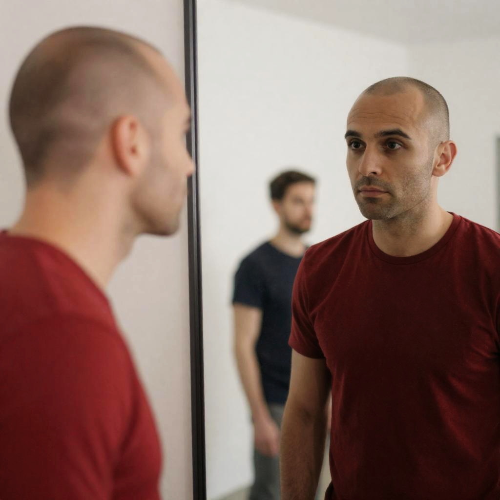Photograph of a bald man in a red shirt, looking at his reflection in a window. Another person is in the background, blurred. Mirror divides the image, showing both the man's side and front views. Neutral indoor lighting.
