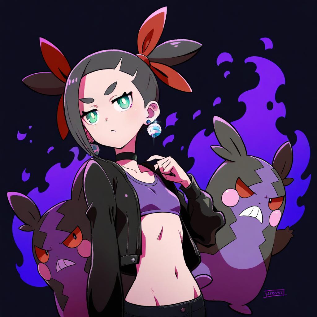 Morpeko (hangry), pokemon, 1girl, hand up, aqua eyes, green eyes, black hair, medium hair, asymmetrical bangs, short twintails, twintails, hair ribbon, small breasts, navel, collarbone, open jacket, black jacket, red ribbon, black choker, long sleeves, black nails, nail polish, earrings, pokemon (creature), stomach, by artist sonson (eleven), animagine