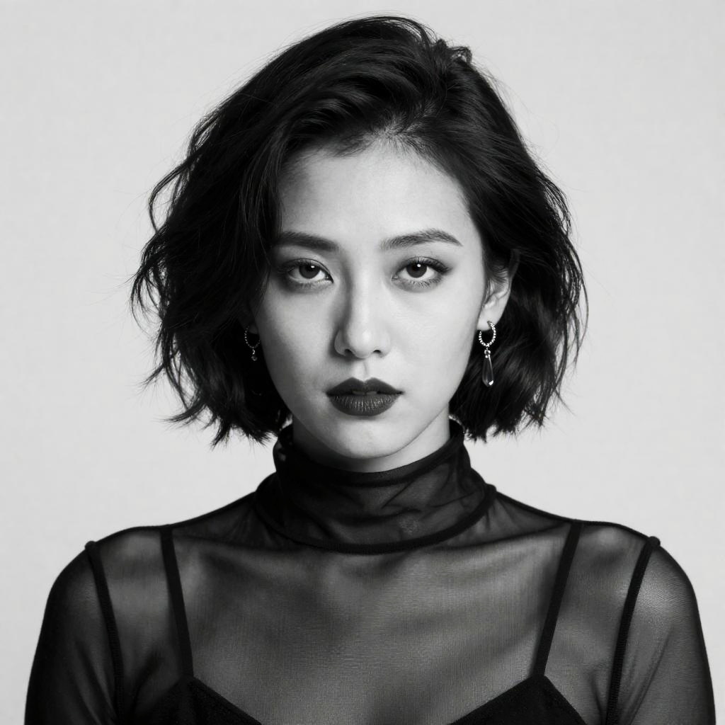 Black and white photograph of a woman with short, wavy hair, wearing a sheer, high-neck top. She has intense, slightly downturned eyes, dark lipstick, and wears dangling earrings. Background is plain and light gray. Upper body portrait.