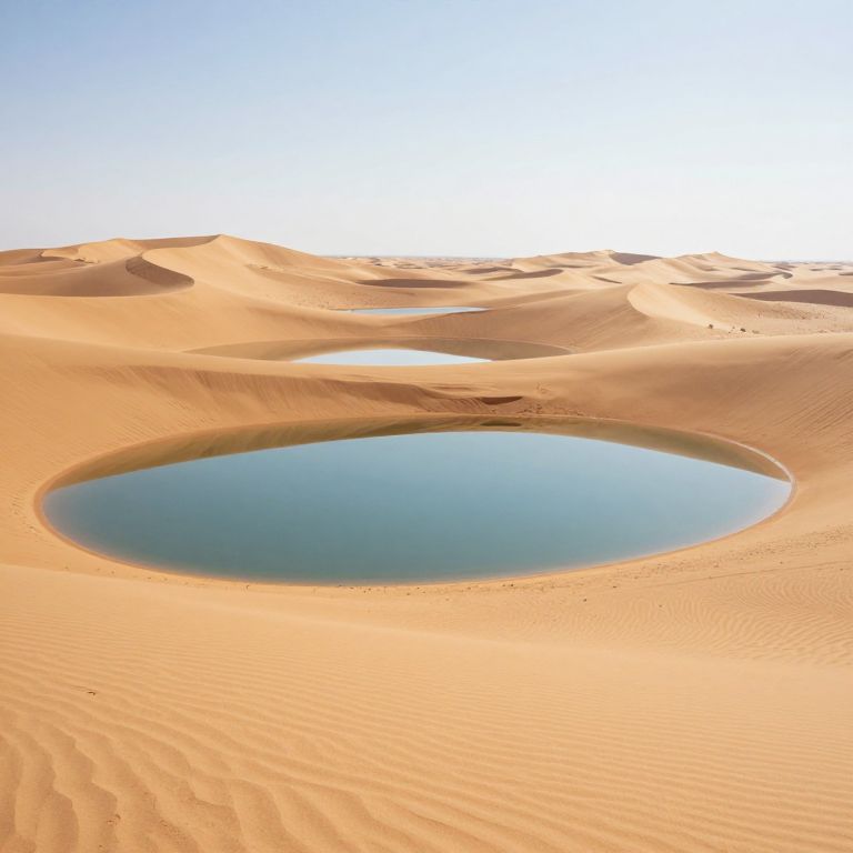 In a vast desert of undulating sand dunes, perfectly formed pools of water mirror the sky with unnaturally smooth surfaces, defying the arid environment and hinting at hidden, otherworldly forces.