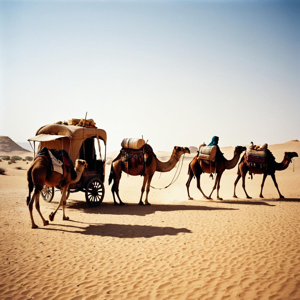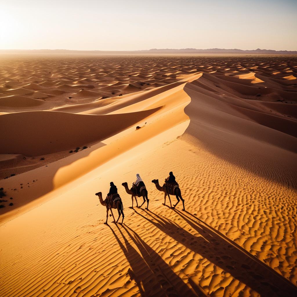 Photorealistic scene of a camel caravan crossing desert dunes, in Sahara Desert, Morocco, wide landscape shot from above, cinematic, warm golden hour sunlight, shot with ultra-wide angle, 50mm lens.