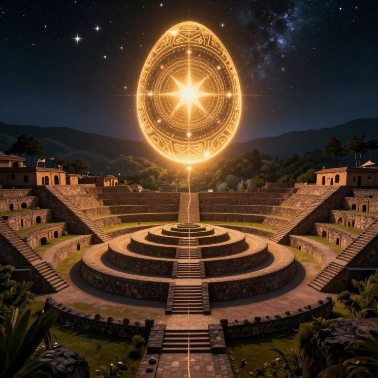 The image depicts a highly detailed and photorealistic representation of a sacred site in Cusco, Peru, known for its ancient architecture and spiritual significance. The scene is set against a dramatic, starry night sky with a glowing, cosmic egg-like structure hovering above a series of concentric, spiral staircases that lead down into the earth. The egg is adorned with intricate patterns and a radiant star at its center, symbolizing a cosmic portal or gateway. The staircases are constructed from stone, with a mix of earthy tones and textures, and are surrounded by lush greenery. The overall composition is symmetrical, with the egg and staircases aligned in a harmonious balance. The lighting is dramatic, with a warm, golden hue illuminating the scene, enhancing the sense of sacred geometry and the connection to the natural world. The image also features elements of the Peruvian shamanic tradition, such as the umbilical cord connecting to the mother earth's womb, representing the spiritual journey and the ascent to higher consciousness. The scene is imbued with a sense of cosmic vibration and the presence of star beings, suggesting themes of ascension and the interconnection of the physical and spiritual realms. The image is extremely detailed, with micro-level textures and numeracy, and is presented in an 8k, HD format, capturing the intricate details of the sacred site and its surrounding environment.