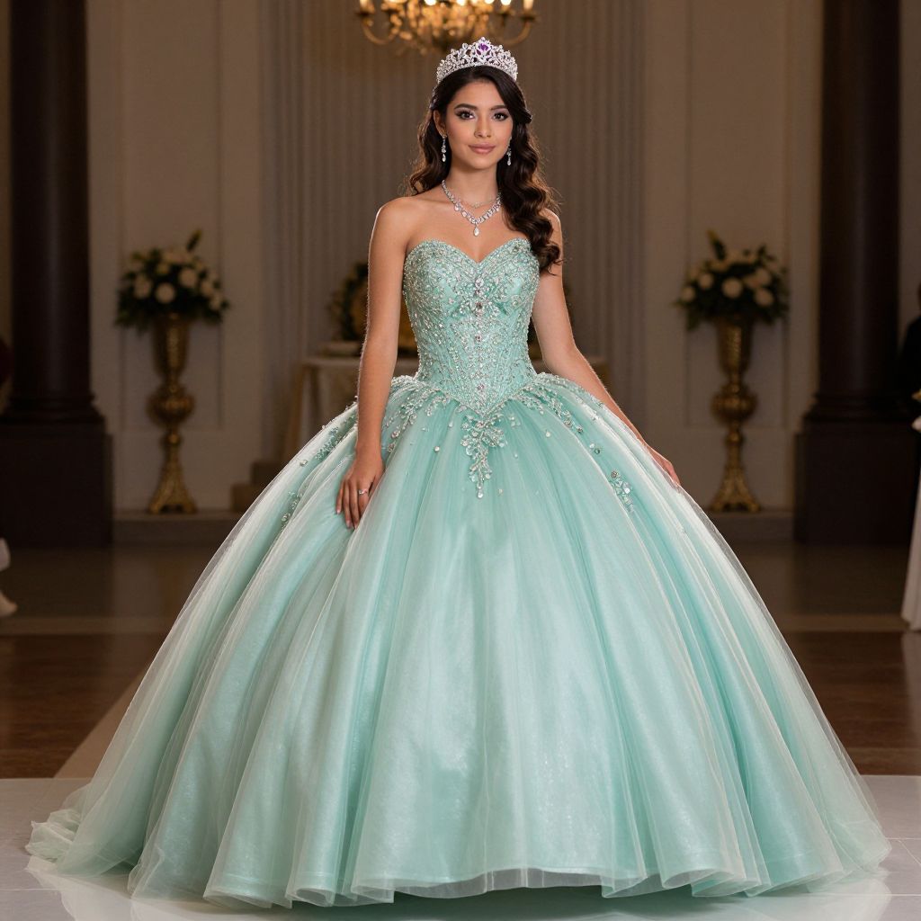 Model showcasing a stunning two-piece quinceañera dress featuring a mint green strapless top adorned with intricate beaded sequins and crystals, paired with a flowing tulle skirt, complemented by a sparkling tiara and elegant jewelry, embodying the elegance of a sweet 16 or debutante event.