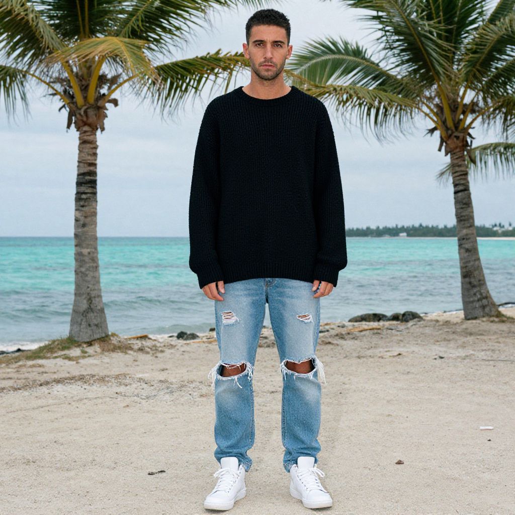 Photograph of a young man standing on a sandy beach with two palm trees in the background. He has short, dark hair and a trimmed beard. He wears a black, long-sleeve sweater, light blue, ripped jeans with large tears on both knees, and white sneakers. The ocean is visible behind him, with a clear, blue sky above. The beach has scattered small rocks and a few distant buildings on the horizon. The overall style is casual and relaxed, with a tropical, coastal vibe. The image has a slightly enhanced, digital, almost hyper-realistic effect.
