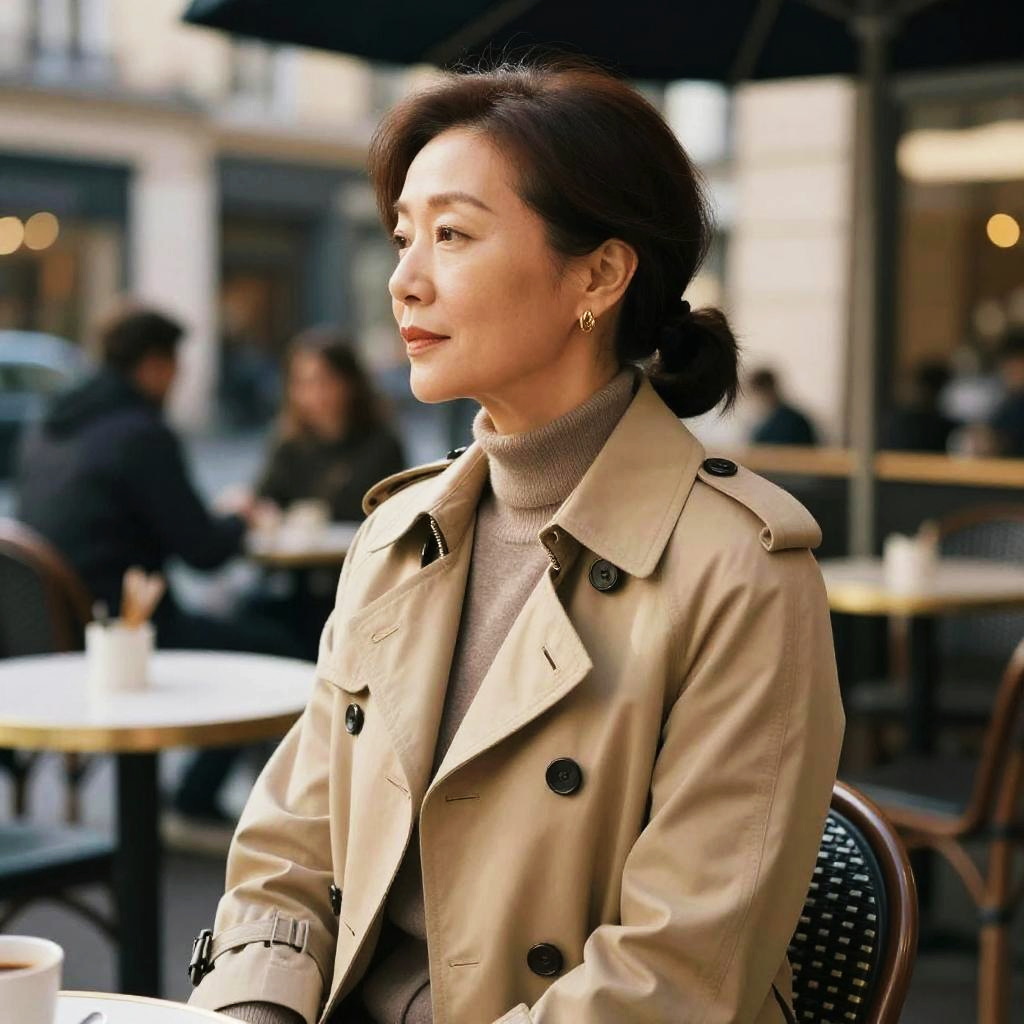 Photograph of an Asian woman with short black hair, wearing a beige trench coat, seated in a sunlit café, with blurred patrons in the background