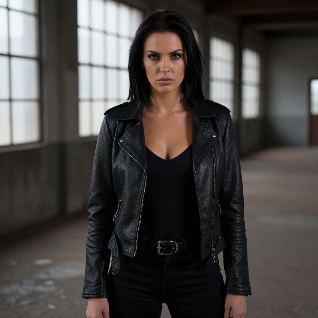 Photograph of a dark-haired woman standing in a gritty, industrial setting. She has a serious expression, with piercing eyes, and wears a black leather jacket over a low-cut black top that reveals some cleavage. Her black pants are belted with a silver buckle. The background is blurry, featuring large, dimly lit windows and concrete walls, adding a moody, urban vibe.