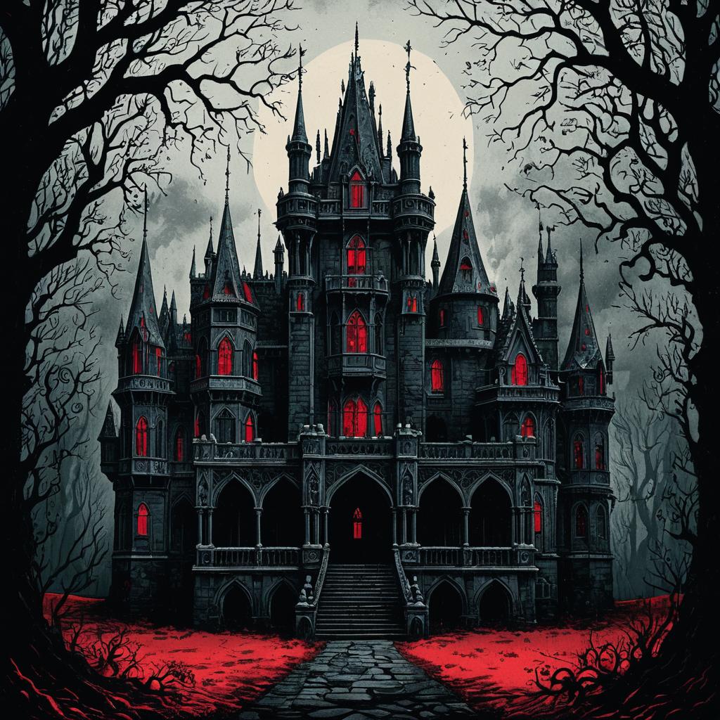 Illustration of a Gothic Revival style enchanted castle with detailed spires and ornate architectural elements, set against a large moon and framed by twisted leafless trees. The scene features a shadowy grisaille color palette with striking crimson accents in the windows and ground, creating a dramatic and mystical atmosphere inspired by Gustave Doré.