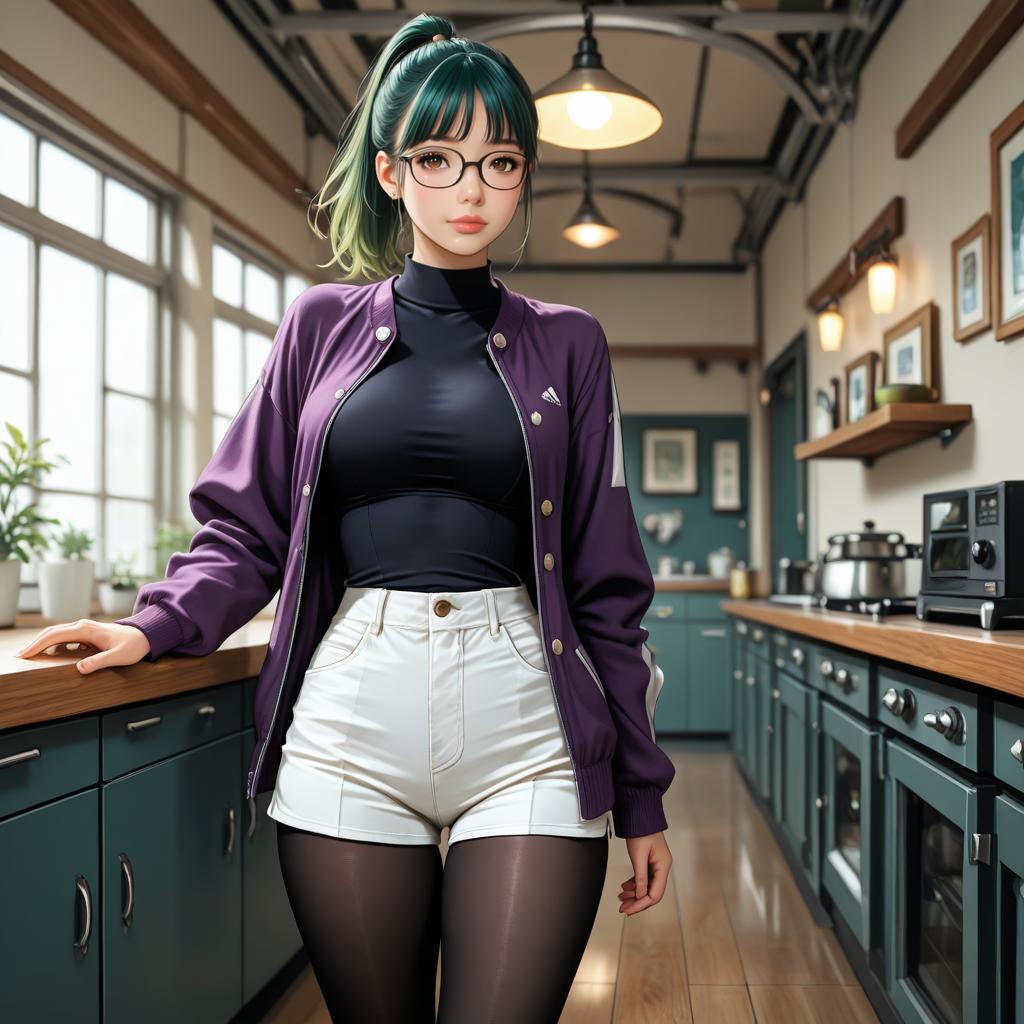 Digital artwork of an Asian woman with green hair in a high ponytail, wearing black-rimmed glasses, a black turtleneck, white high-waisted shorts, black tights, and a purple jacket with a small white logo on the chest. She stands in a modern kitchen with wooden floors, teal cabinets, and stainless steel appliances. Natural light filters through large windows on the left, while pendant lights hang from the ceiling. Her expression is neutral, and she leans casually against a wooden counter with her right hand. The kitchen has a warm, inviting atmosphere.