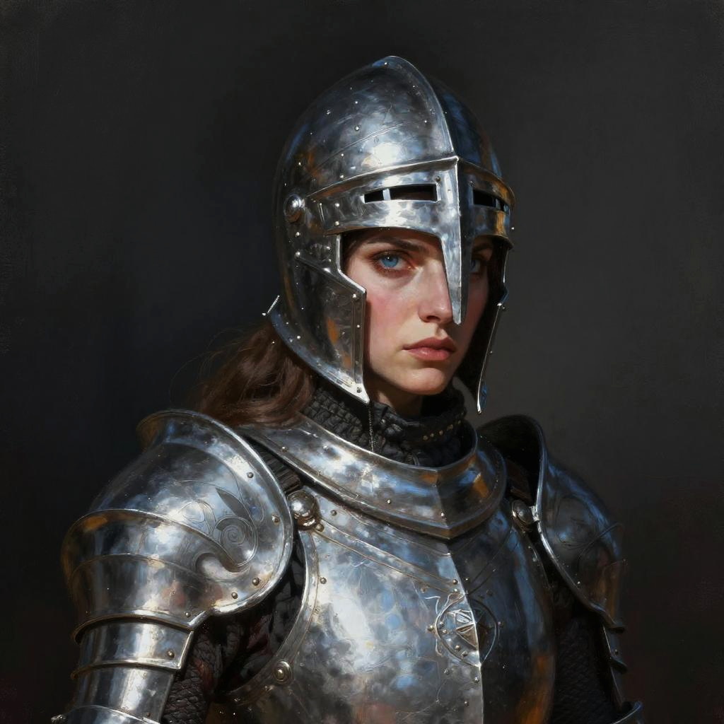 A painting of a celestial knight in armor with radiant starlight eyes, representing duality of courage and vulnerability, double exposure effect, in the style of Andrei Riabovitchev, auto-destructive art, intricate oil painting, an oil on canvas