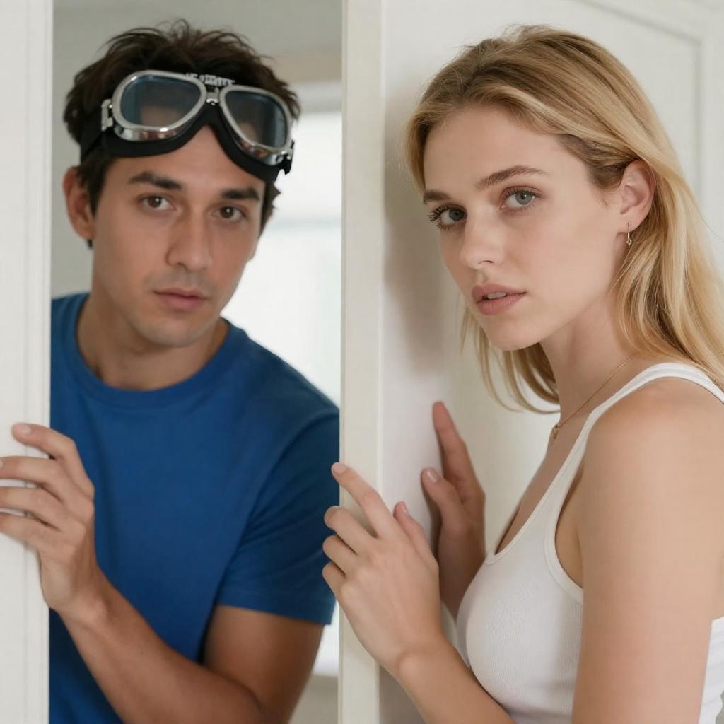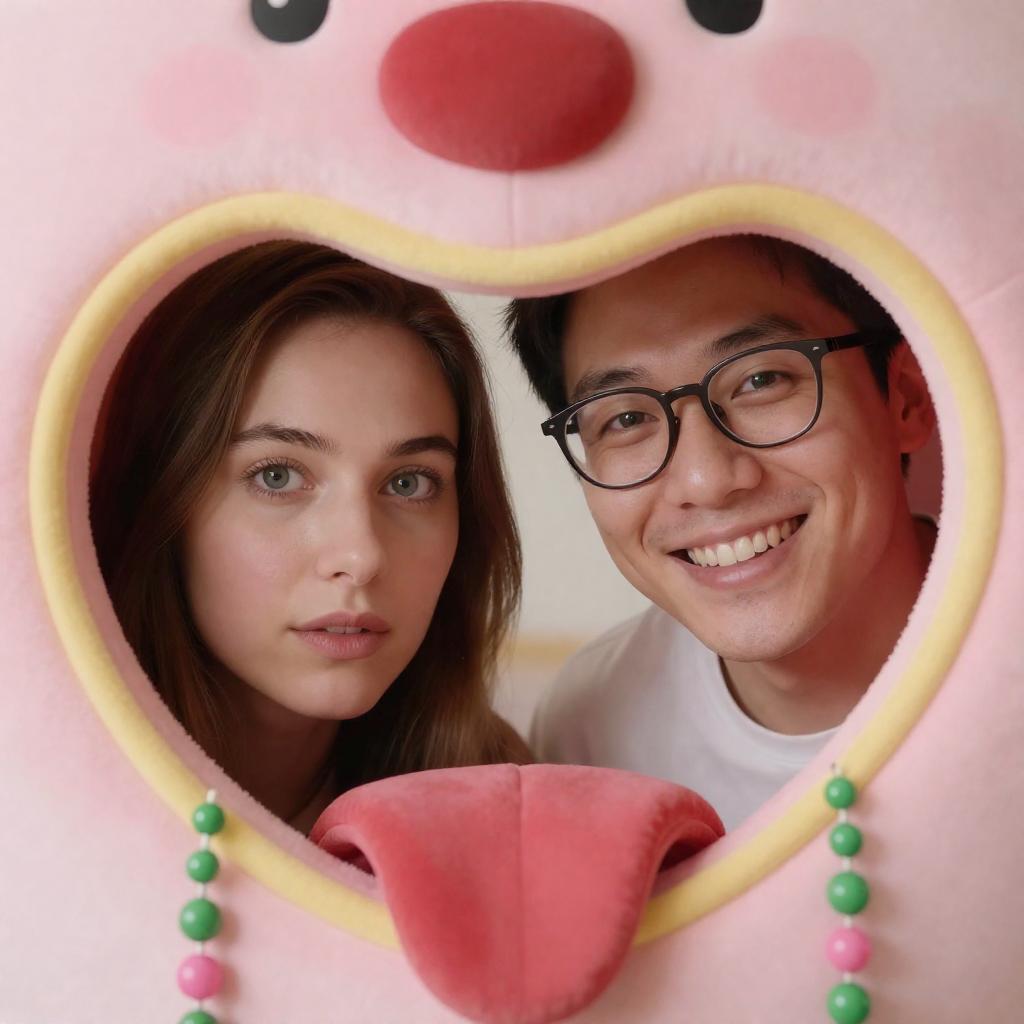 Photograph of two people peeking through a pink, heart-shaped, plush toy's mouth. Woman on left has brown hair, green eyes, neutral expression. Man on right has glasses, grinning, wearing a white shirt. Red tongue and pink fabric inside toy. Pink and yellow plush edges. Green and pink beads hanging.