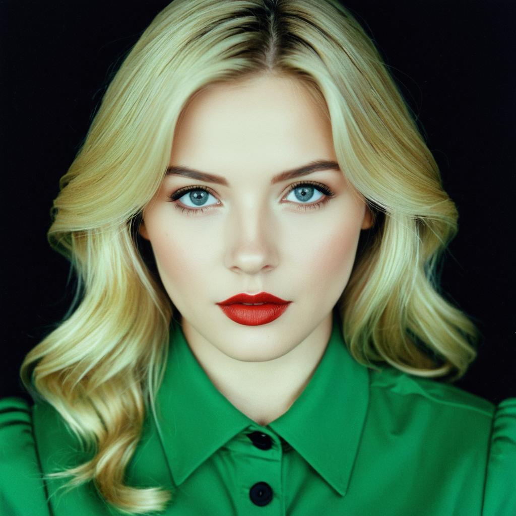 Green fancy dress costume,solo, 1girl, realistic, looking at viewer, blonde hair, green shirt, closed mouth, blue eyes, shirt, red lips, portrait, green dress, lips, lipstick