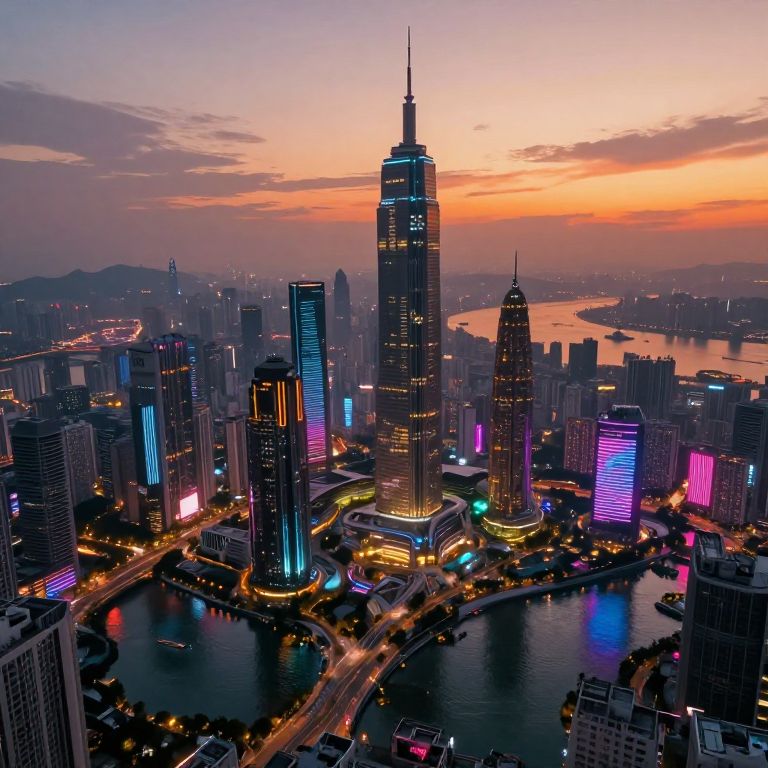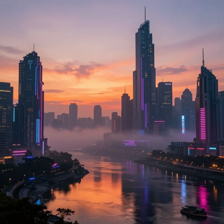 Complete image AI generating a surreal futuristic cityscape at sunset, intricate details blending nature and technology, vibrant neon lights reflecting in water, hyper-realistic textures, cinematic atmosphere, wide-angle perspective, digital art style.