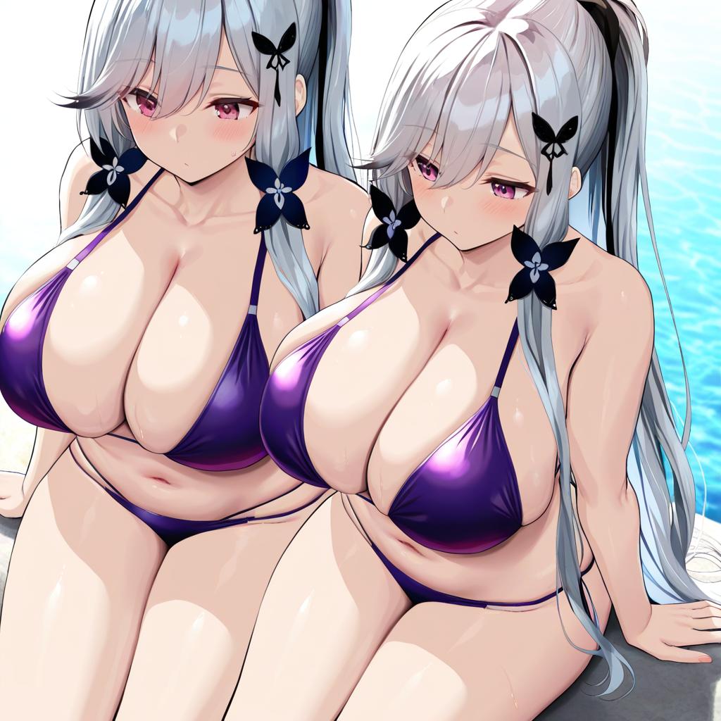 Dunkerque (azur lane), azur lane, 1girl, red eyes, pink eyes, grey hair, long hair, very long hair, butterfly hair ornament, sidelocks, ponytail, large breasts, cleavage, thighs, navel, purple bikini, bare shoulders, by artist oekakizuki, illustrious