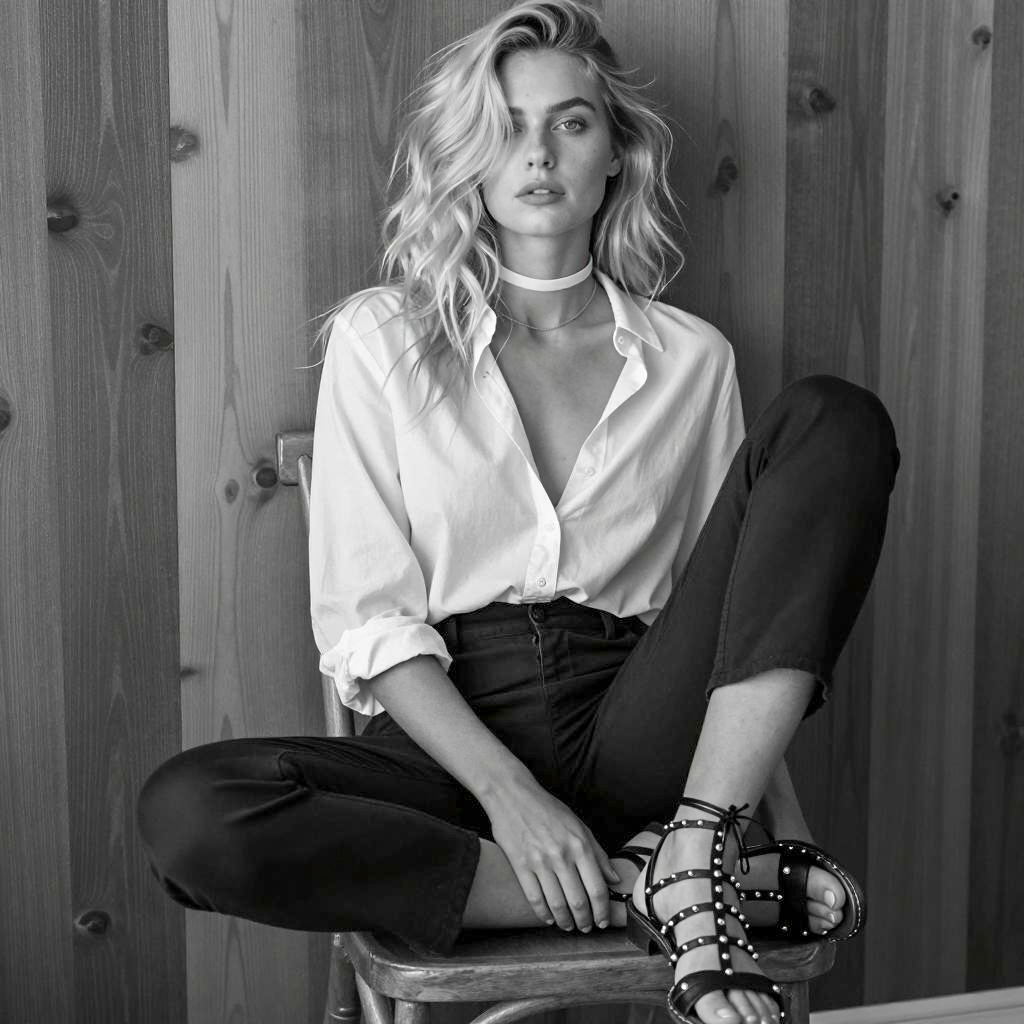 Black and white portrait of a blonde woman with light skin sitting cross-legged on a wooden chair. She wears a loose white deep V-neck blouse, black high-waisted pants, and black lace-up sandals with gold studs. The woman has wavy hair partially covering her right eye and accessorizes with a white choker and a thin necklace. The background features a dark wooden paneled wall.