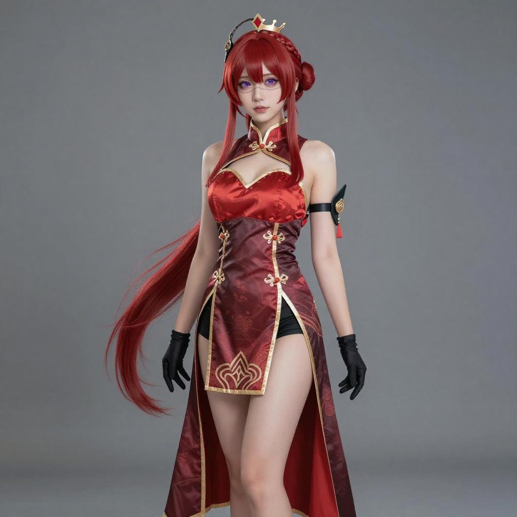 This is a digital CGI image of a young woman with long, flowing red hair and purple eyes. She wears a red, form-fitting, Chinese-style dress with gold embroidery and high slits, exposing her black underwear. The dress has a deep neckline and black arm bands. She also wears black gloves and a small, silver tiara with a red gem. Her skin is pale, and she stands against a plain, gray background. Her expression is neutral, and her pose is slightly forward, with one hand on her hip. The overall style is anime-inspired with a focus on detailed, vibrant colors and realistic textures.