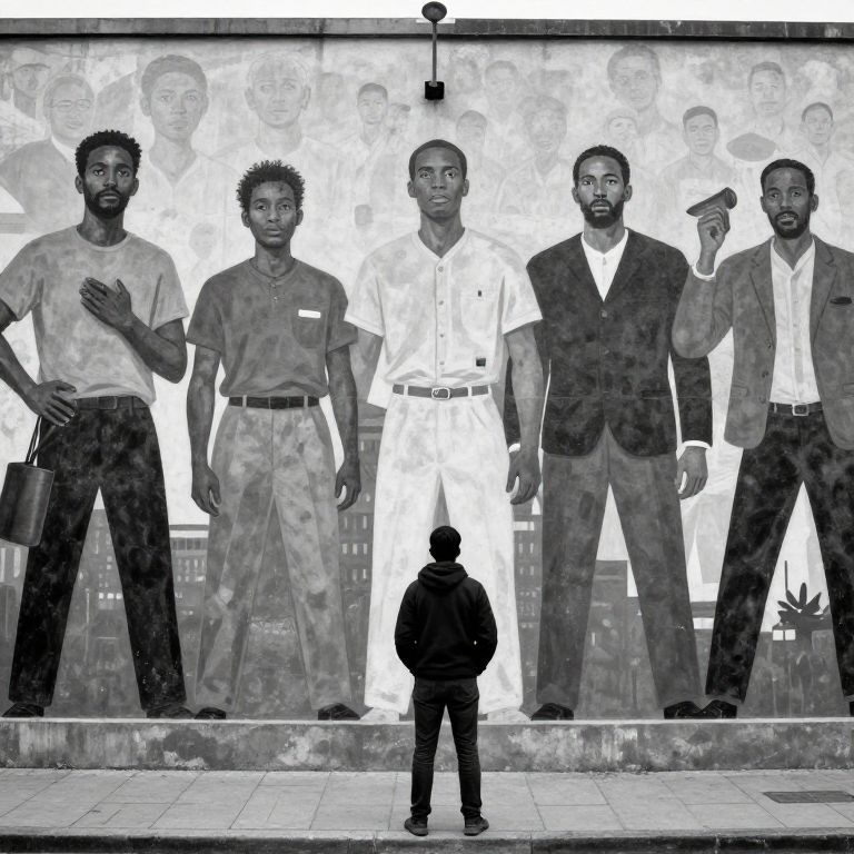 A powerful black and white photograph of a single person standing in front of a large mural depicting historical moments of social change, symbolizing the ongoing fight for equality and justice in modern society.