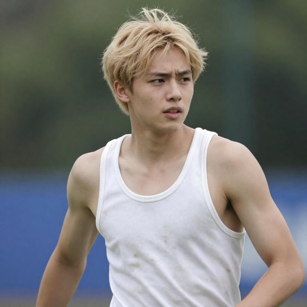Photograph of a young man with blonde, slightly tousled hair, wearing a white, slightly dirty tank top. He is outdoors, with a blurred green and blue background. His expression is intense, looking to the side. He is in motion, with his right arm slightly raised.