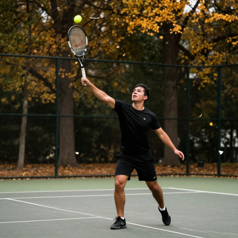 A lone male player in a sleek black racquet sport outfit with a slightly sweat-dampened face, standing mid-action on a quiet weekend court, focusing on a high-impact smash, surrounded by trees and an autumnal setting with golden leaves falling slowly.