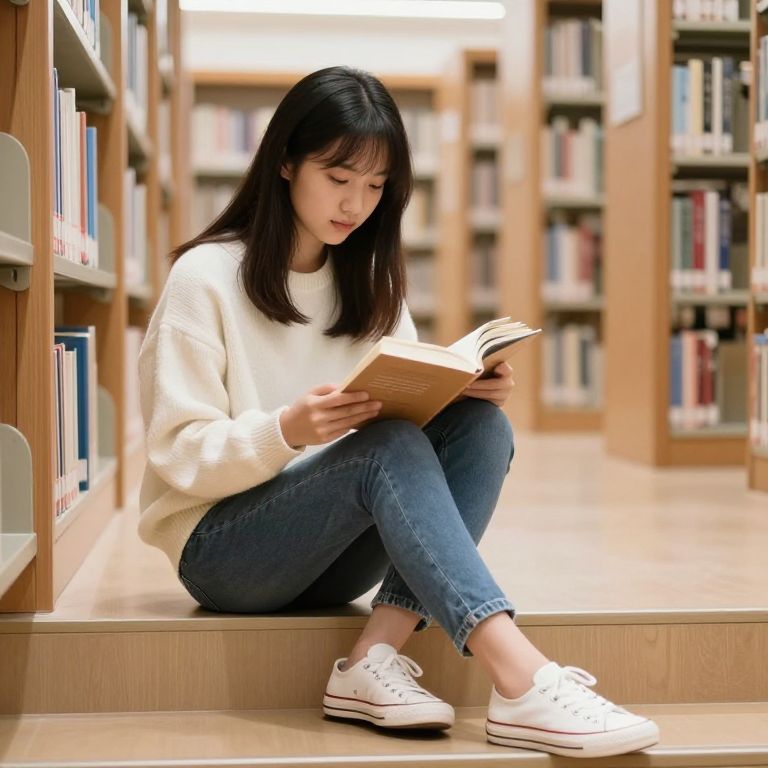 Photograph of an Asian woman with long black hair, sitting on a wooden step in a library. She is wearing a white, chunky knit sweater, blue skinny jeans, and white sneakers with black stripes. She is intently reading a book with a brown cover, holding it open with both hands. The background features tall bookshelves filled with books, creating a warm, lit atmosphere. The woman's expression is focused and calm. The image has a soft, slightly overexposed look, enhancing the cozy library setting.