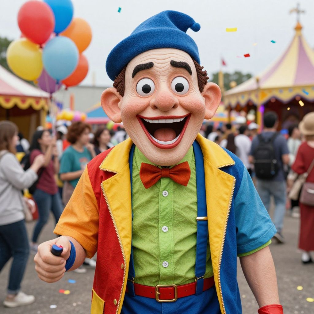 A quirky Norbit costume with exaggerated facial prosthetics and bright, mismatched clothing, standing in a lively carnival scene with balloons and confetti, detailed textures, dynamic expression, vibrant and cartoon-like rendering