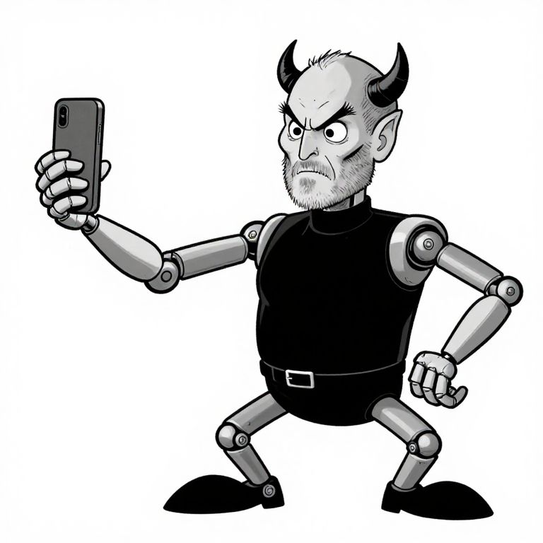 Exoskeleton Steve Jobs is terrified of demons obsessively trying to take selfies with him. 1950s black and white cartoon style, disney style.,