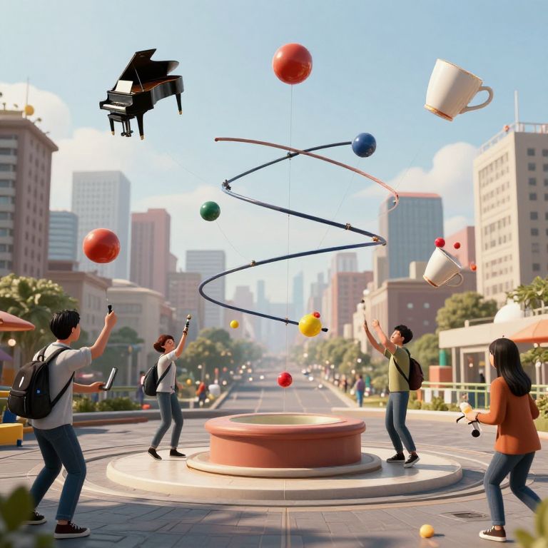 Digital art of four people juggling colorful balls, a black piano, and a white cup in a sunny urban plaza.
