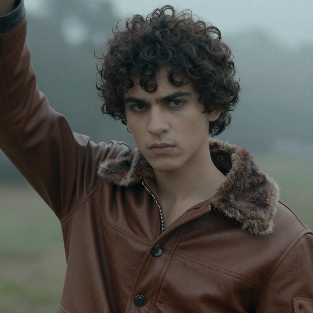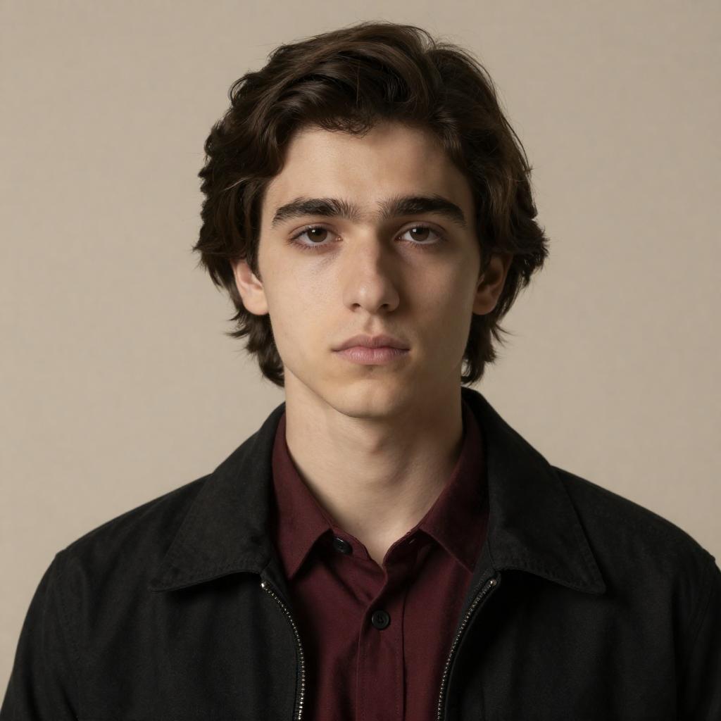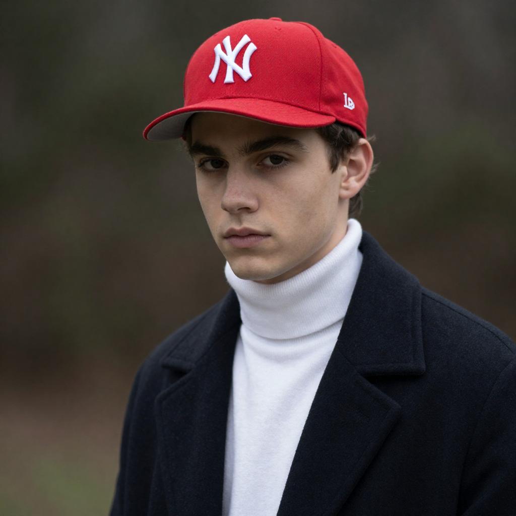 Photograph of a young man with light skin and brown hair, wearing a red baseball cap with "NY" in white letters, a white turtleneck, and a dark coat. He has a serious expression and is slightly turned to the right. The blurred background features green and brown foliage.