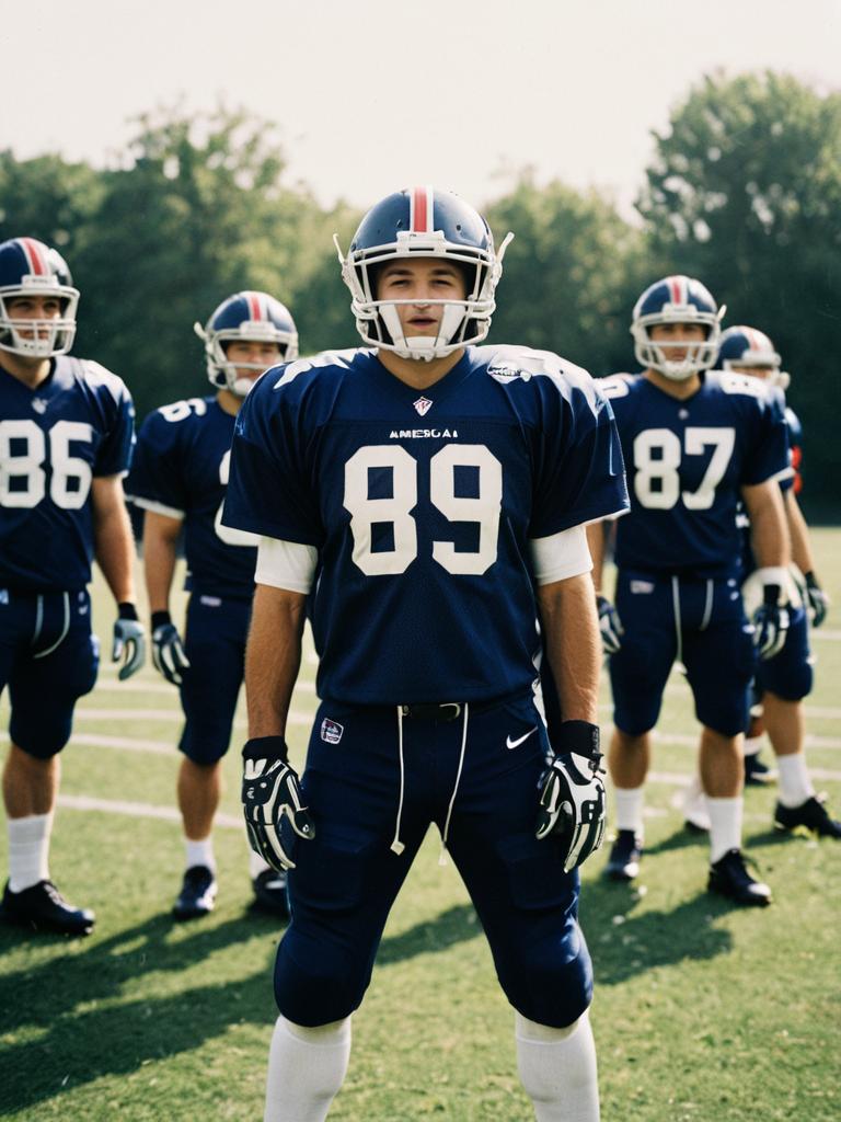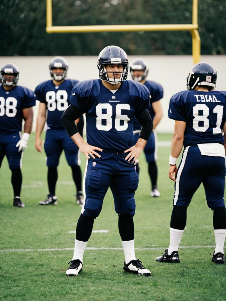 A group of American football players in full blue and white uniforms practicing on a grassy field under natural daylight. The players wear helmets and cleats, with numbers prominently displayed on their jerseys. The player in the center wears number 86 and stands with hands on hips, surrounded by teammates engaged in practice near a goal post.