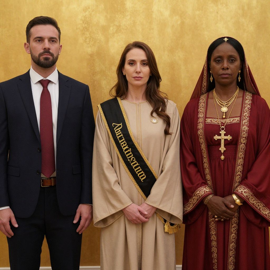 Three individuals stand solemnly against a golden background, each dressed in distinct attire: a man in a dark suit with a red tie and brown belt, a woman in a beige robe with a black sash bearing gold lettering, and another woman in a rich red gown adorned with intricate gold jewelry and a cross pendant.