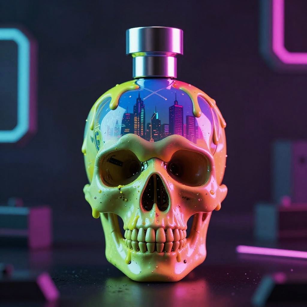 Skull perfume bottle dripping with vibrant neon colors, cyberpunk cityscape reflected on its surface, futuristic design, highly detailed, dynamic lighting
